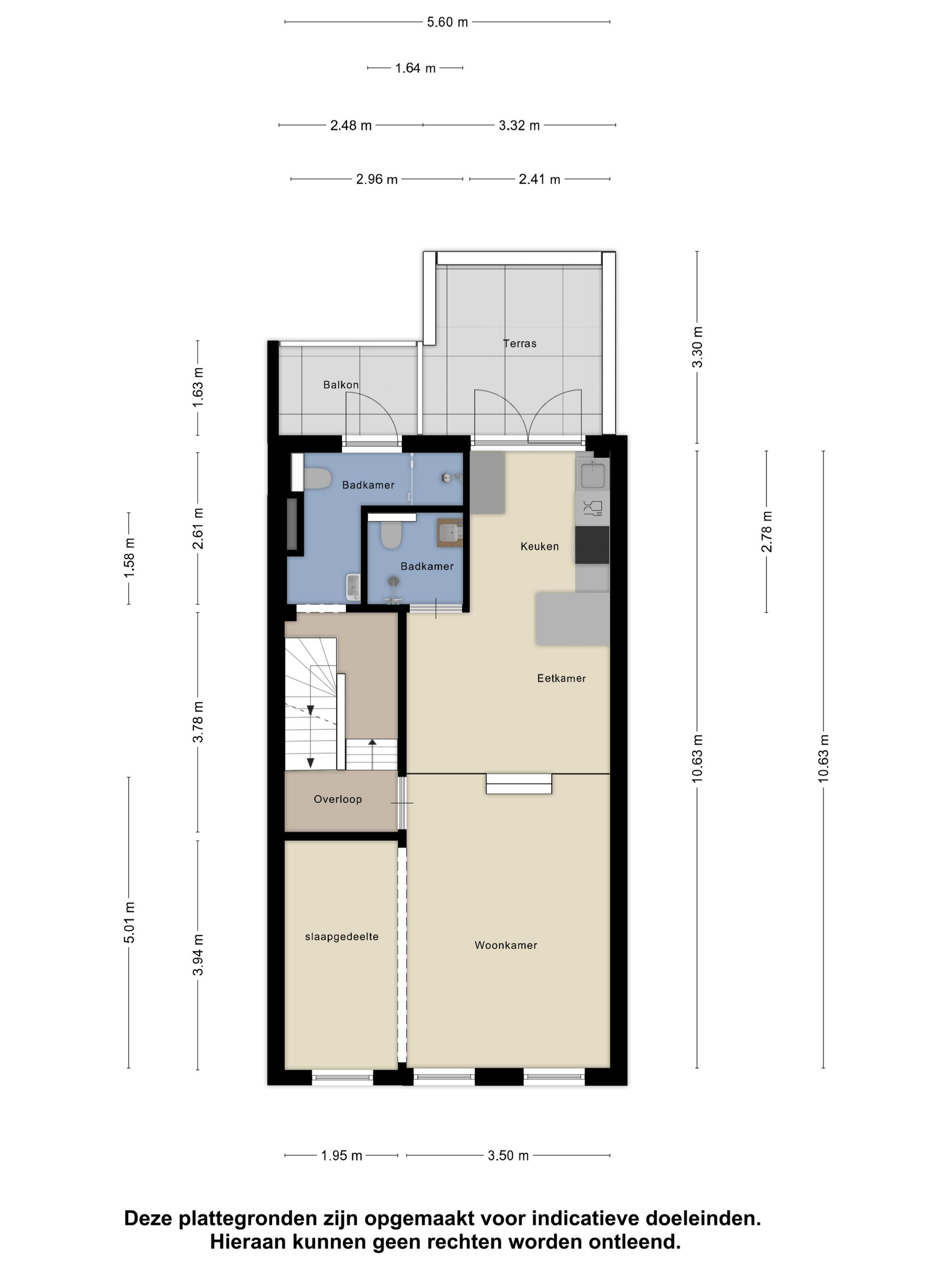 Verder zijn er twee badkamers op deze verdieping. De eerste badkamer met een douche, toilet en wastafelmeubel is vanuit de woon-/eetkamer te bereiken. Badkamer 2 is vanaf de overloop te bereiken. Deze ruimte, in een L-vorm, biedt ook ruimte aan een douche, toilet en een wastafelmeubel. Vanuit deze badkamer is toegang tot het balkon.